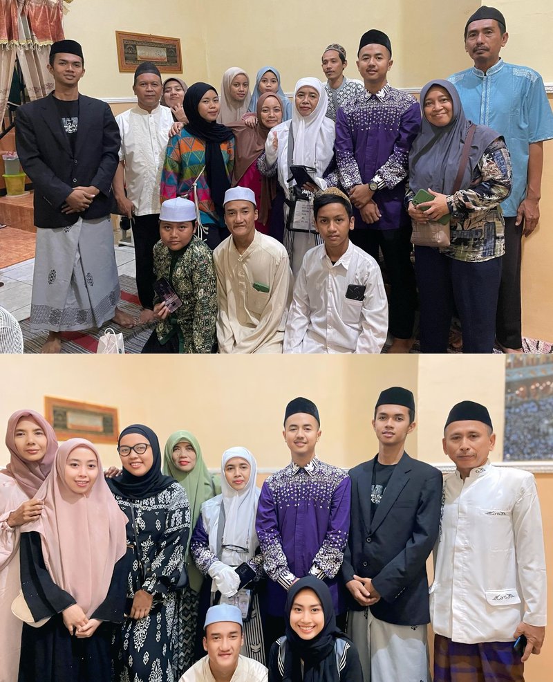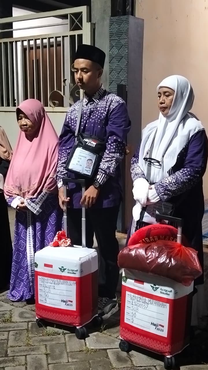 Lailiyatul Mufarrihah (batik ungu berjilbab putih) dan Muhammad Nuruddin Islam (batik ungu bersongkok hitam) bersama keluarga sebelum berangkat haji, Selasa malam, 27 Mei 2025. Dok. Nuruddin