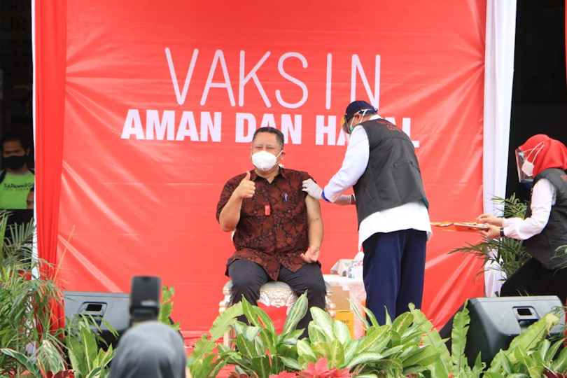 JATIMNET.COM, Surabaya - Vaksinasi Covid-19 di Kota Surabaya mulai dilakukan di halaman Balai Kota Surabaya, pada Jumat 15 Januari 2021. Pelaksana Tugas (Plt) Wali Kota Surabaya Whisnu Sakti Buana dan jajaran Forum Pimpinan Daerah (Forpimda) Surabaya divaksin pertama kali. Hal ini untuk memberikan contoh dan menunjukkan bahwa vaksin itu aman dan halal.