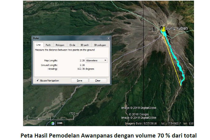 Berdasarkan pemodelan jika sebagian besar volume material kubah lava saat ini runtuh, maka awan panas dapat meluncur ke arah Kali Gendol sejauh 2,2 km (< 3 km). Perhitungan ini berdasarkan asumsi kondisi kubah lava tidak stabil. Adapun saat ini kondisi kubah lava masih stabil berada tepat di tengah kawah.