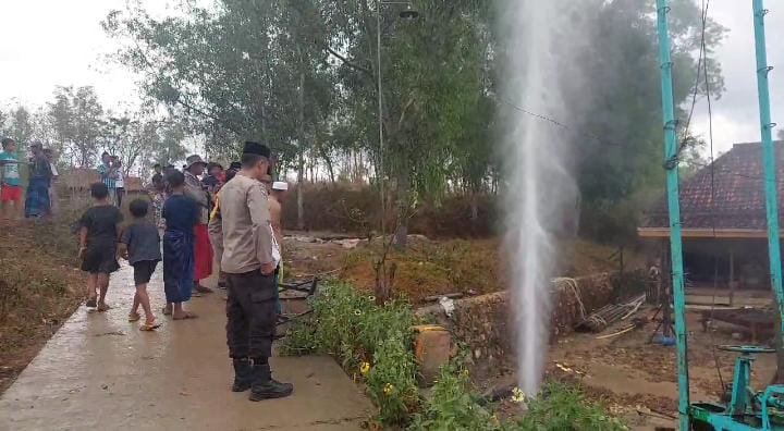 Polisi dan sejumlah warga di Desa Pandan, Kec. Omben, Kab. Sampang melihat dari dekat semburan air yang keluar dari sumur bor milik warga setempat, Jumat 2 Agustus 2024. Foto: Zainal Abidin